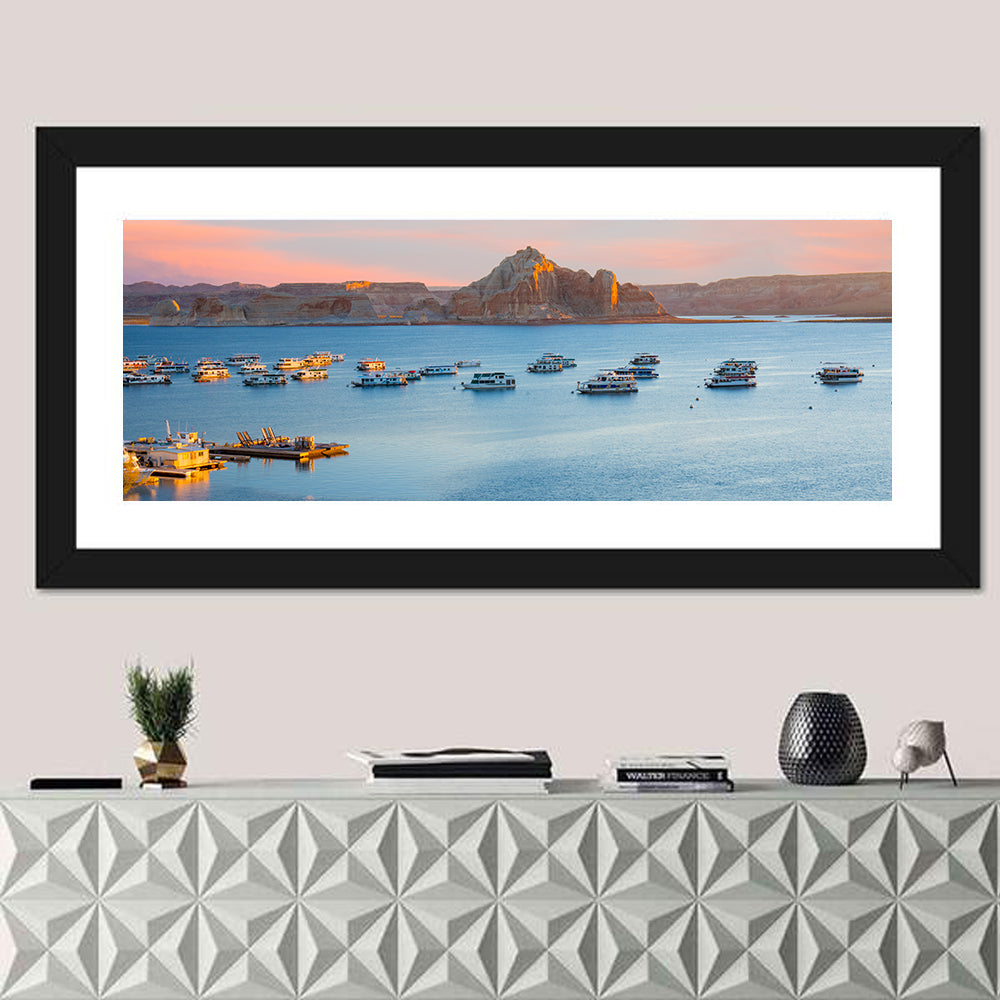 Add a touch of natural beauty to your walls with this stunning Lake Powell wall art. Featuring a breathtaking sunrise and Houseboats near Wahweap Marina, this CanvasPiece print is a powerful statement piece. Perfect for art lovers and home decorators alike, it evokes a range of emotions and adds a touch of warmth to any room.